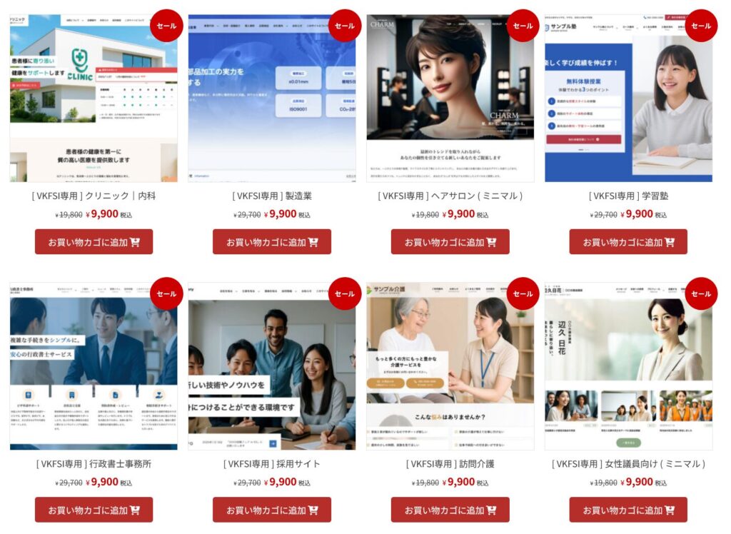 「学習塾」「行政書士事務所」「クリニック」「訪問介護」「製造業」「ヘアサロン」「採用サイト」など全8種類のデモサイトデータが