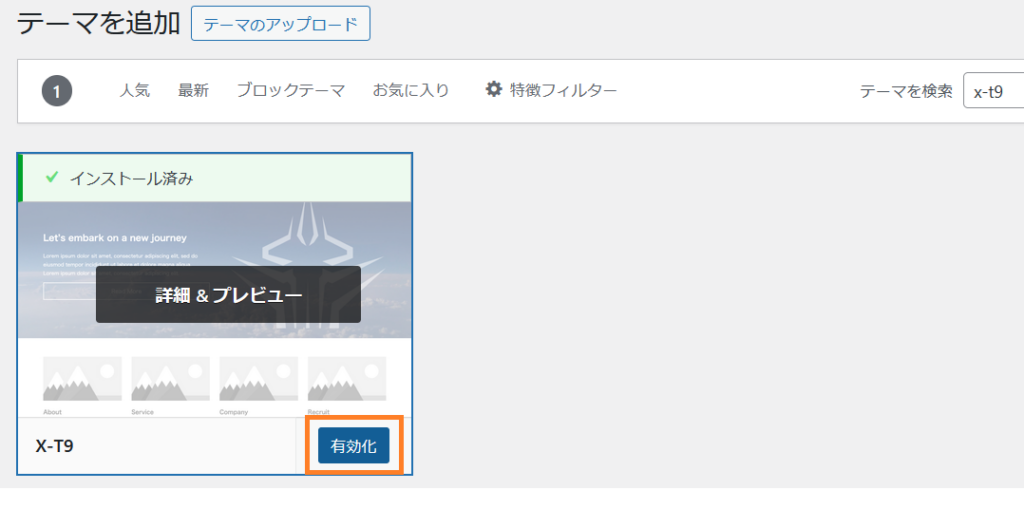 ➀管理画面 ➡ 外観 ➡ テーマの画面を表示します。テーマを追加をクリックしテーマの検索に「X-T9」と入力すると下記のように表示されます。「インストール」をクリックしてインストールします。