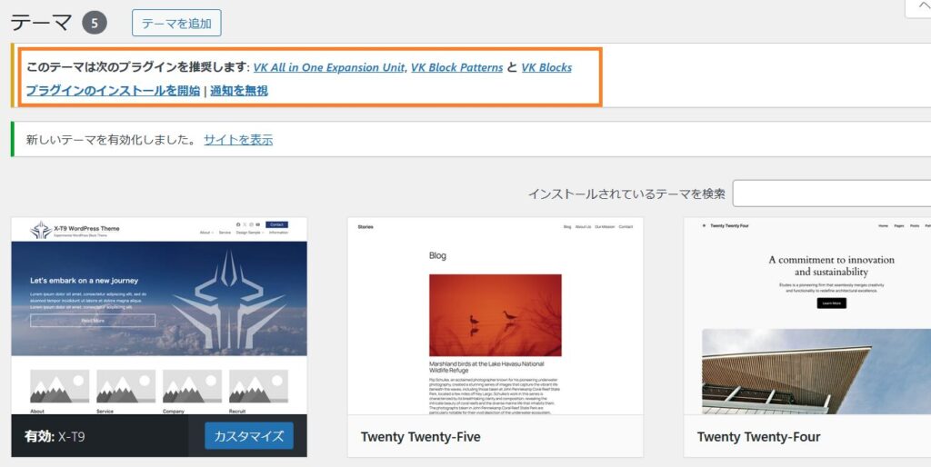 赤枠に書かれているようにテーマ「X-T9」を使うための必須プラグインをインストールします。