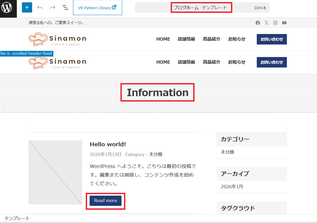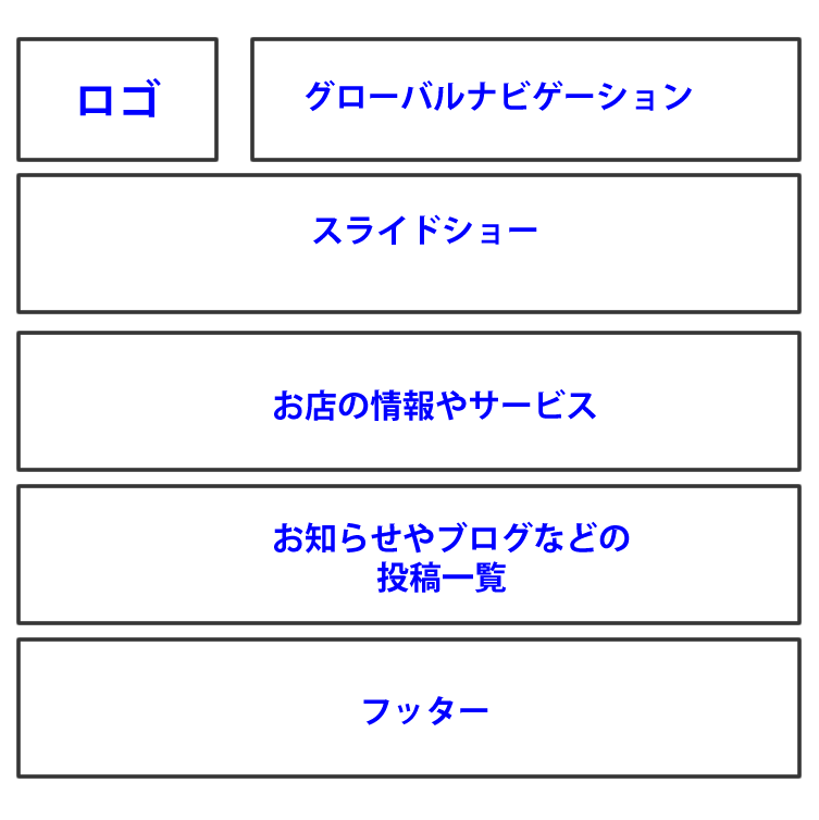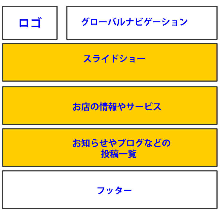 コンテンツの部分、ここでは「お店の情報やサービス」「お知らせやブロブなどの投稿一覧」を作成していきます。