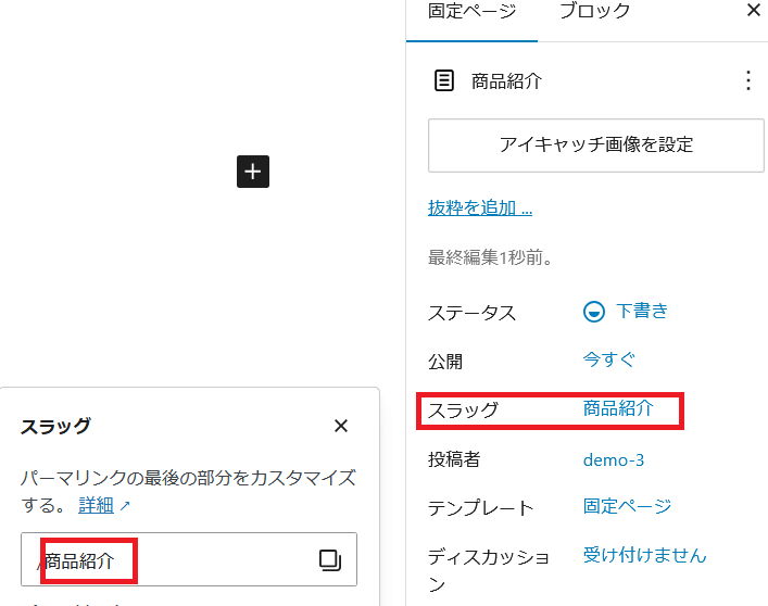 固定ページの作成でタイトルに日本語を入れるとスラッグの所にそのまま日本語が挿入されます。テーマ「X-T9」では作成保存後にスラッグを変更すると面倒になるので、固定ページ作成の最初にスラッグを英数字表記にすることを忘れないようにしましょう。