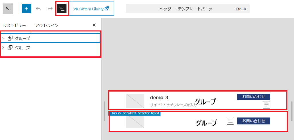 ヘッダーのテンプレートが表示されました赤枠の所をおクリックすると左側のリストビューがひょじされます。