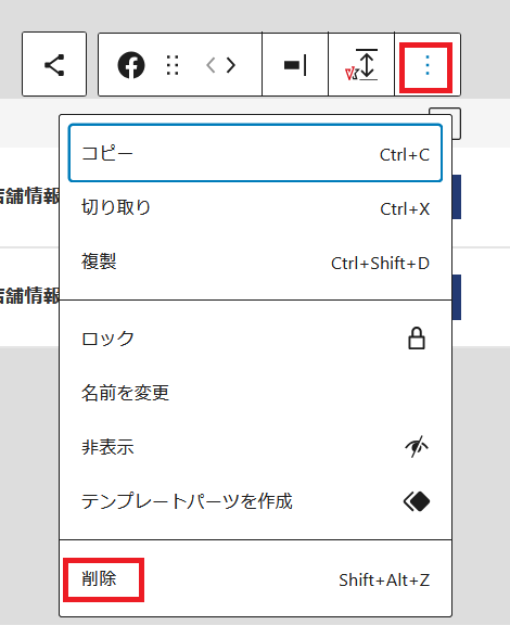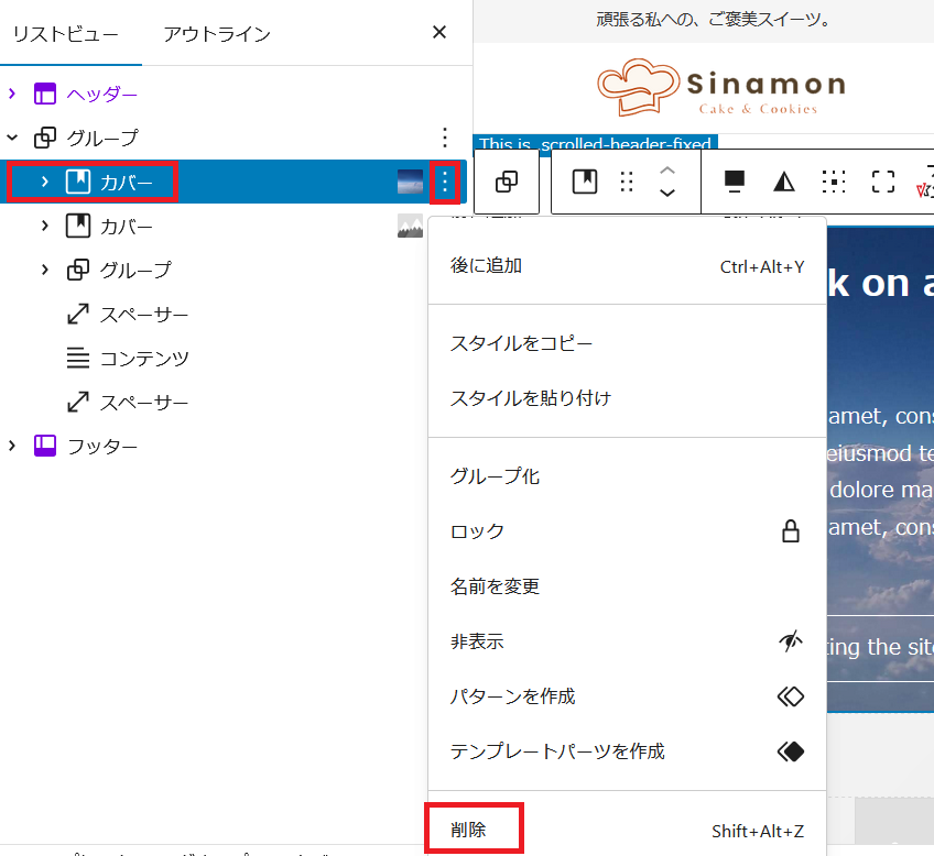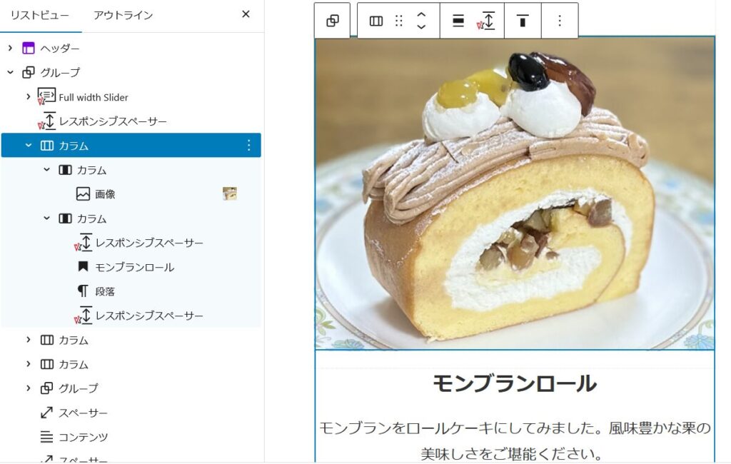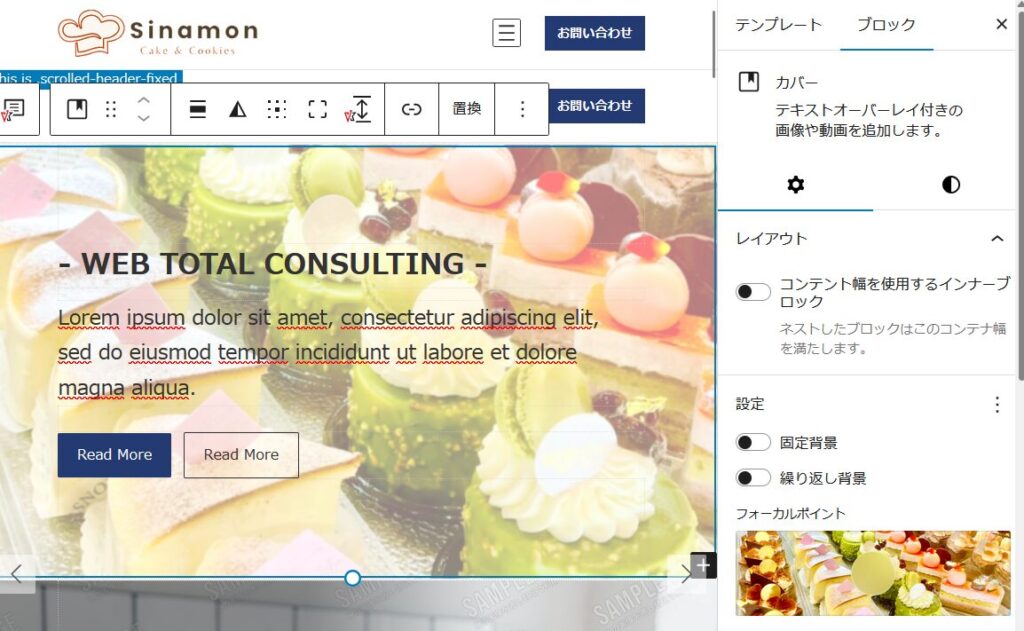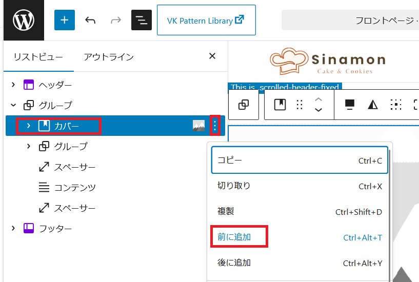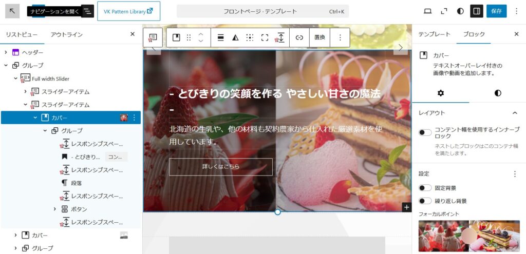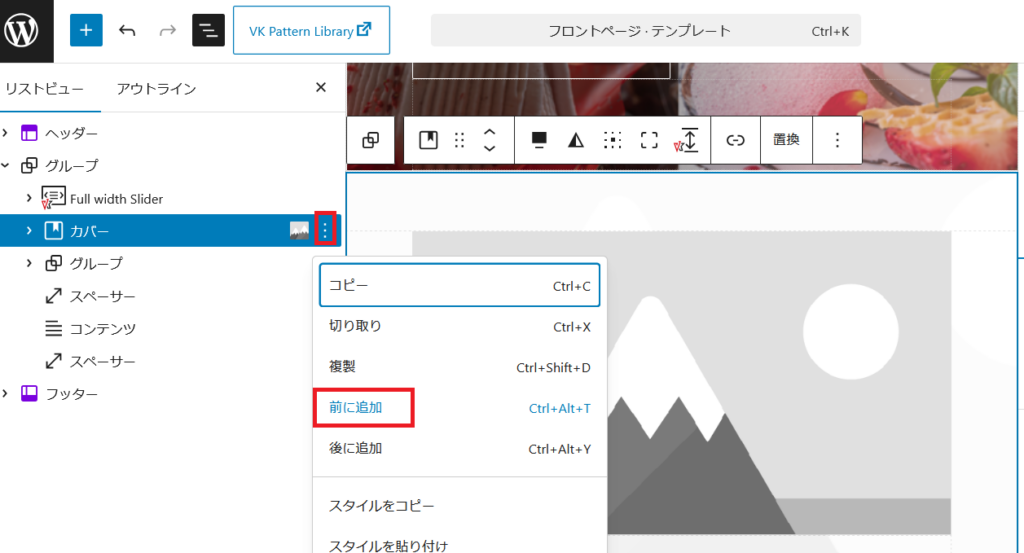 コンテンツの「お店の情報やサービス」の所でケーキの紹介などを入れたいので、スライダーショーの下のカバーの上に赤枠オプションをクリックして「前に追加」でブロックを追加します。