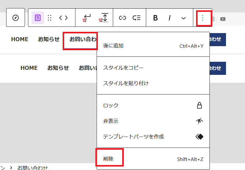 お問い合わせはボタンがあるので、赤枠の所お問い合わせを選びオプションを選び削除をクリックします。