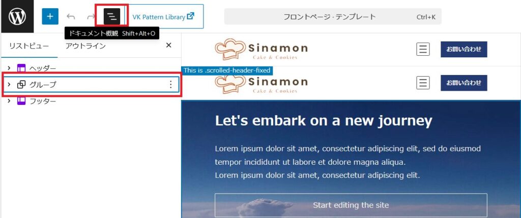 お知らせの箇所はドキュメント概要で見ると赤枠のグループで作成されています。
