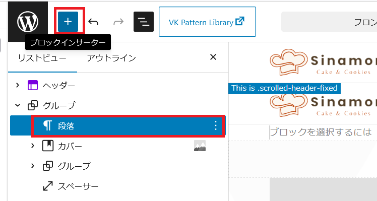「段落」が挿入されました赤枠の「ブロックインサイダー」をクリックします。