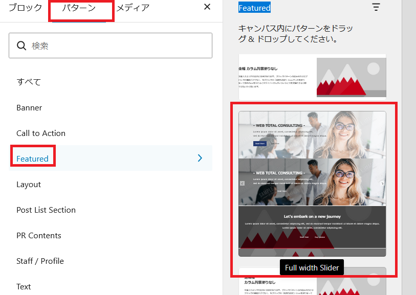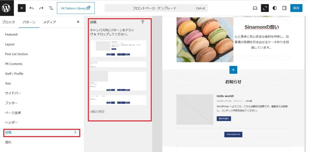 次に「パターン」をクリックします。パターン下の赤枠「投稿」の「 〉」をクリックすると赤枠のようなパターンが表示されますので、ここで好きなパタンを挿入できます。