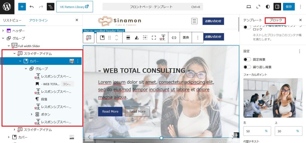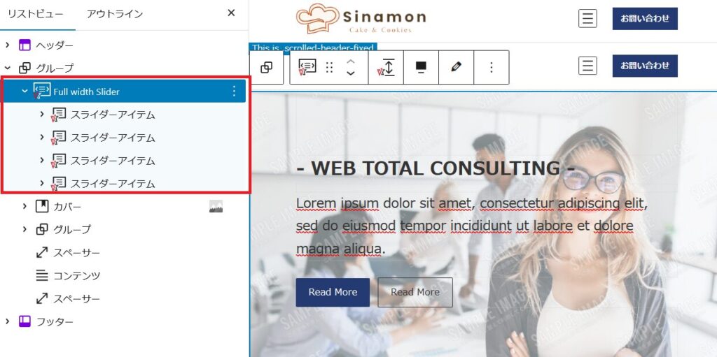 左側赤枠のスライダーアイテムを見ると見出しや文字・ボタンなど含まれています。こちらで自由にカスタマイズできます。