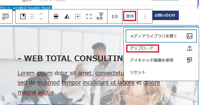 赤枠「置換」をクリックします。今回は画像をアップロードしますので赤枠をクリック画像をアップロードします。
