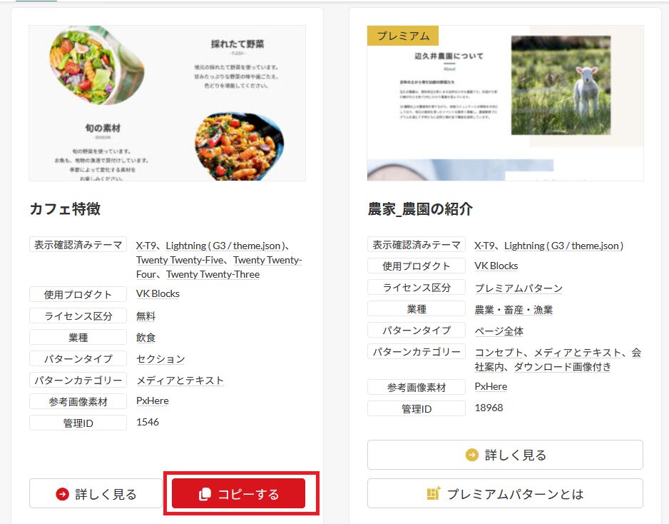 カフェ特徴のパターンを使用したいので赤枠の所の「コピーする」をクリックします。