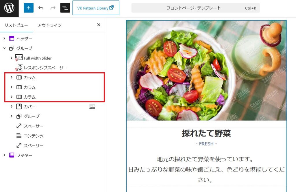 ここではフロントページのテンプレートを使い編集していきます。