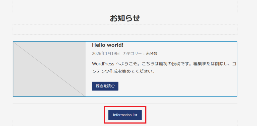 赤枠の「Infomation list」の文字を日本語の「お知らせ一覧」に変更しておきます。