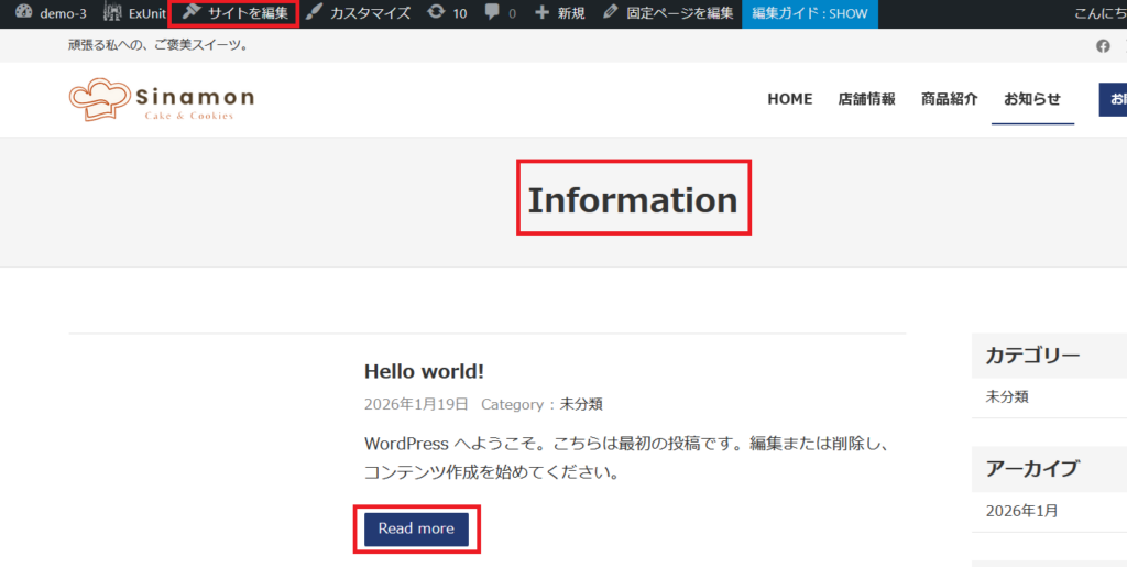 赤枠の「Infomastion」「Read more」を日本語に変更しましょう。