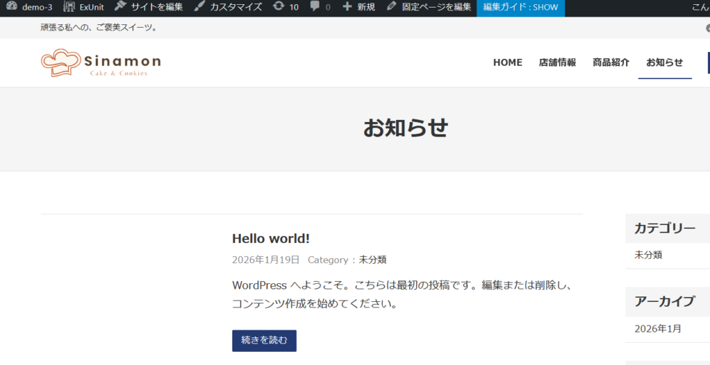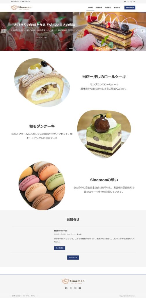 今回のケーキ屋さんのサイトでは、他に店舗情報・商品紹介・お問い合わせ・プライバシーポリシーなどの固定ページも作成しています。