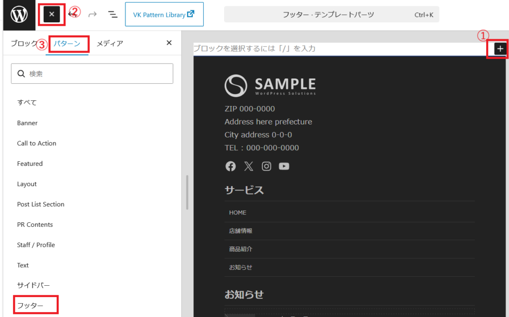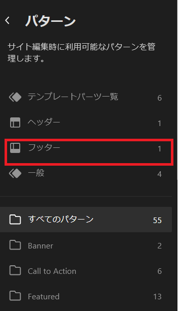 「パターン」下の「フッター」をクリックします。