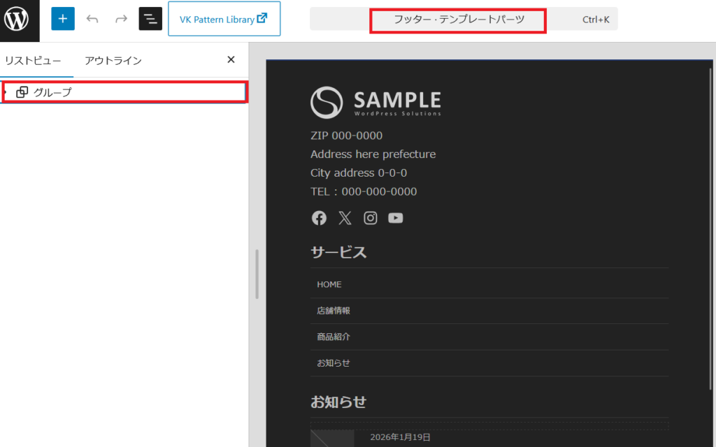 パターンが挿入されたら、最初にあったフッターのグループを削除します。